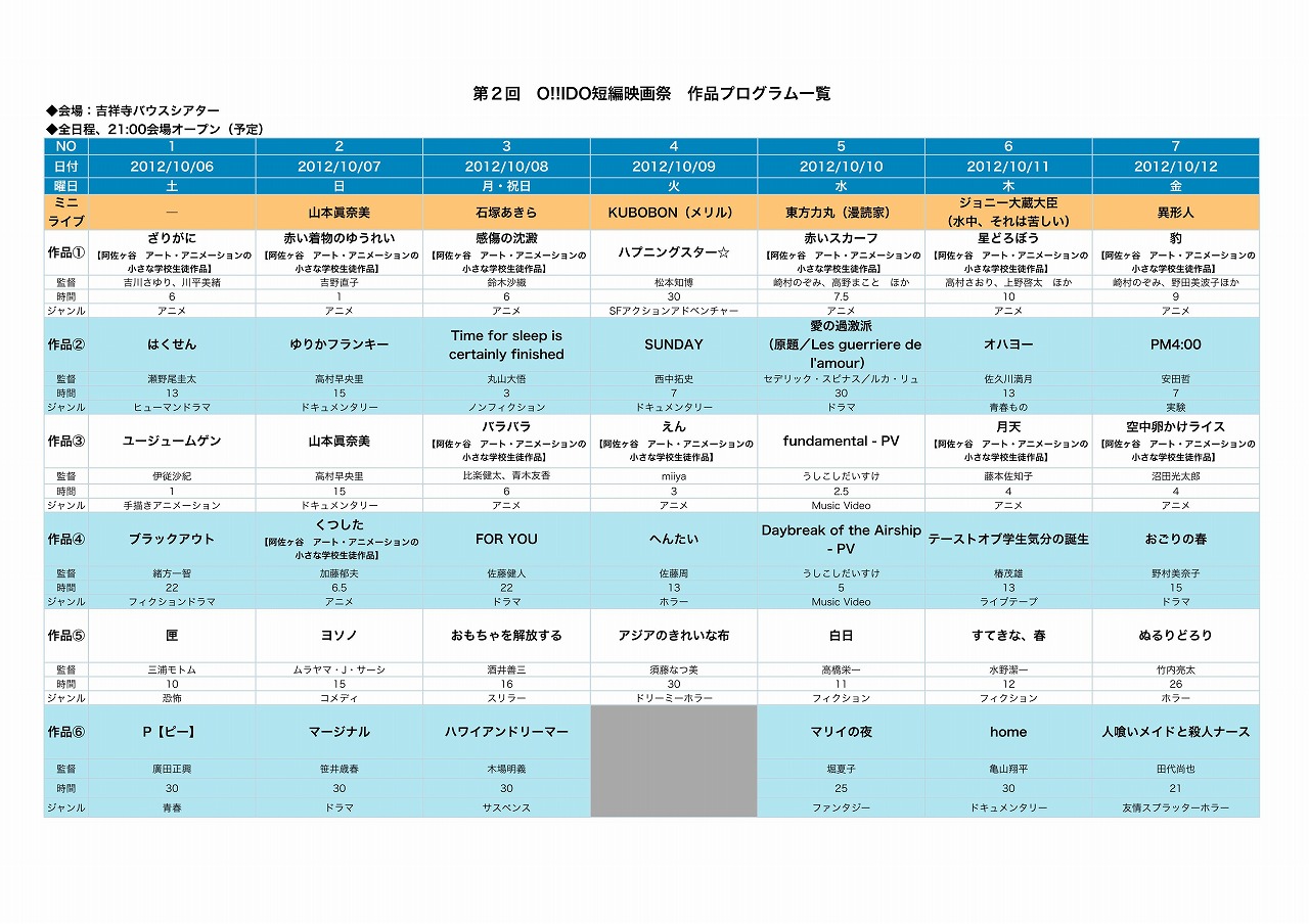 新作「あしにほん」 が、東京の映画祭で上映されることになりました。 「第四回なもたん上映会」 http://ameblo.jp/1979101019861211/entry-11363109072.html 2012年10月14日(日)15日(月) あしにほんは15日19:20~21:15 Fパート内にて上映 期日:2012年10月14日(日),15日(月) 場所:ちいさな学校劇場 杉並区阿佐ヶ谷北2ー12ー19 B1 阿佐ヶ谷駅から徒歩3分 http://www.laputa-jp.com/school/theater_map.html 入場:500円からのチップ制 東京の映像制作団体”名もなき制作団体”の上映会に外部団体として参加しております。 ですので、他の映画もたっぷり見られます。 さっくりとタイムスケジュールのみ転記します ***************************** 第4回なもたん映画祭 (名もなき制作団体短編映画祭) ~タイムテーブル~ ■10月14日日曜日 1240~入場 1255~1300 メイド仮面アクションショー、舞台挨拶 1300~1450 Aパート上映 イタコ、鈍感男、まりも、ノモレス○、メイド仮面8話 1450~1455 舞台挨拶 1455~1510 休憩 1510~1630 Bパート上映 向橋、シャイニーロード、コバルトブルーの空、当然でしょ!?、メイド仮面9話 1630~1645 休憩 1645~1820 Cパート上映 恥ない新聞屋、薫子さん、ももちゃん、メイド仮面10話、桜縁 ※上映後舞台挨拶 ■10月15日 1440~入場 1455~メイド仮面アクションショー 1500~1655 Dパート上映 千葉県CMコンテスト2本、向橋、コバルトブルーの空、鈍感男、ノモレス○、メイド仮面11話 1655~1700 舞台挨拶 1700~1710 休憩 1710~1900 Eパート上映 ももちゃん、イタコ、まりも、当然でしょ!?、メイド仮面12話 1900~1915 休憩 1920~2115 Fパート上映 あしにほん、シャイニーロード、薫子さん、世界は誰のために、恥ない新聞屋 ※上映後舞台挨拶 ~入場料~ 500円からのチップ制 (途中入退場可) *************************************** 東京で上映会でござーい。 月曜ですのでさすがに私はいけませんが、よろしくお願いいたします。 PR |